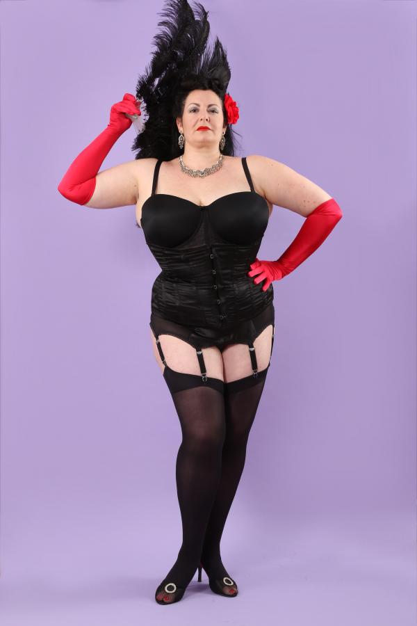 Buxom burlesque dancer wears What Katie Did. CR: Tony Nylons Photography.